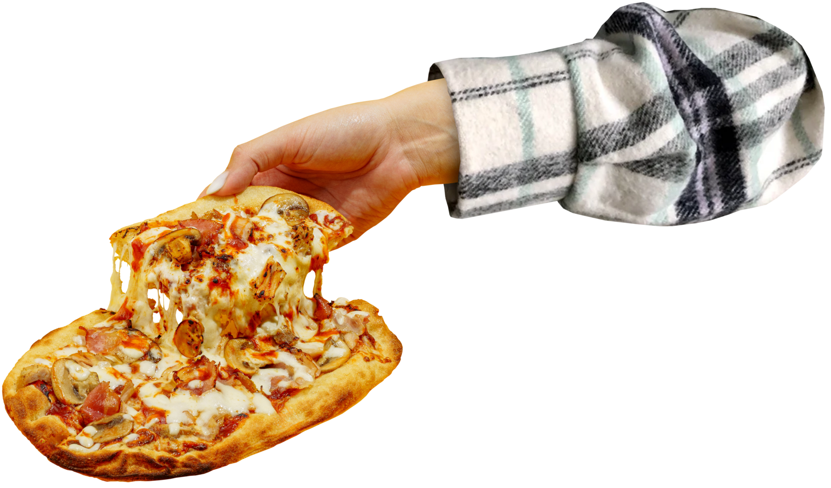 Пышное тесто, грибы шампиньоны, бекон жареный, куриное бедро, сыр моцарелла, соус пицца